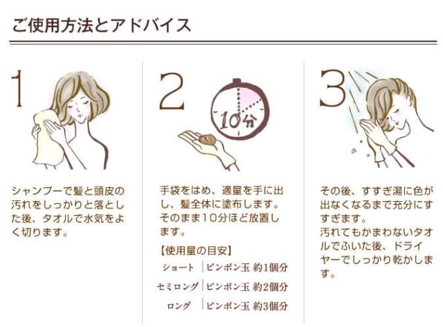 【1】乾いた髪に塗布する。白髪の気になる部分には多めに塗布し、塗布したカラートリートメントが乾燥しないようにラップ等で巻いてください、そのまま20〜60分ほど放置します。