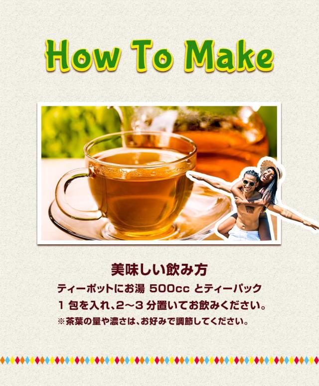 ティーポットにお湯500ccとティーパック1包を入れ、2〜3分置いてお飲みください。