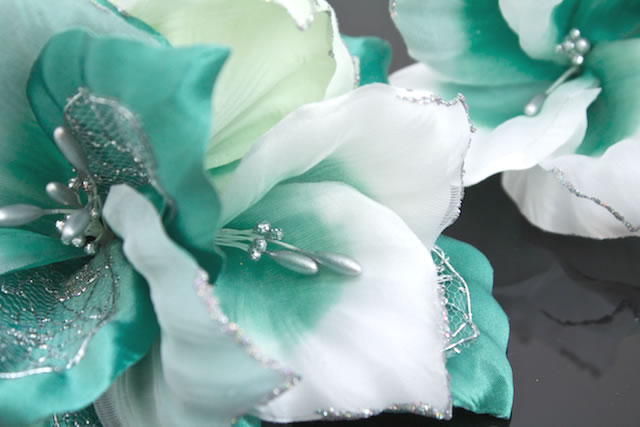 異素材を重ねた花びらに、シルバーレースがゴージャスな雰囲気。