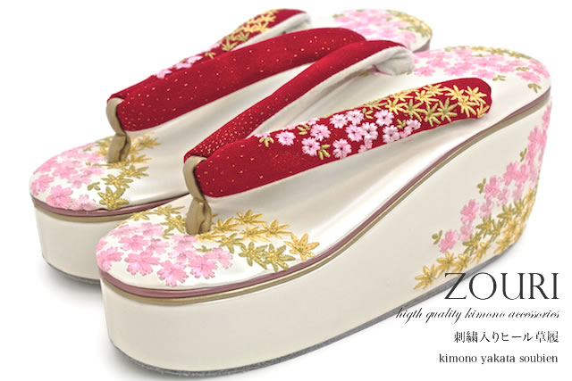 成人式 草履 レディース 振袖 盛装 赤 桜紅葉刺繍 ヒール草履 高ヒール 厚底 合成皮革 【フリーサイズ】