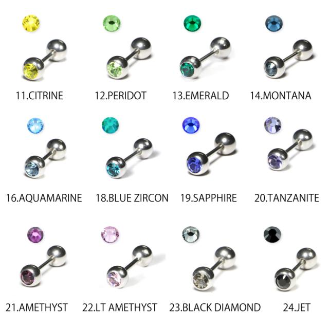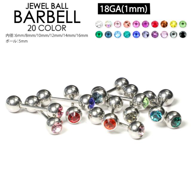 【メール便対応】ジュエル ボール バーベル 18G(1mm) ボディピアス 片側ラインストーン付 サージカルステンレス 5mm玉 軟骨ピアス トラガス 1.6mm 20色┃