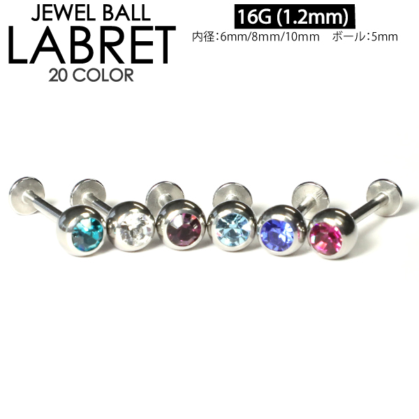 【メール便対応】ボディピアス ラブレット16G(1.2mm) スタッド ジュエルボール5mm玉 20色 サージカルステンレス カラーラインストーン ボディーピアス 定番 口ピアス 16ゲージ ┃