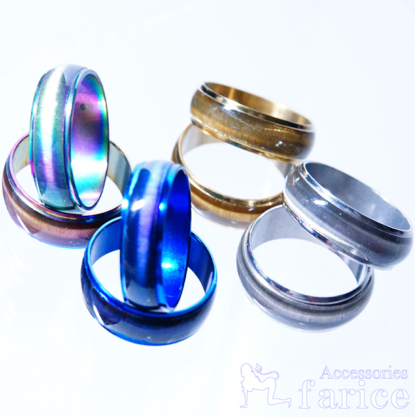 リングの表面にガラスコーティングを施した独特のデザインで、キャッツアイ効果と呼ばれる猫の目のような明るい光の筋が浮かび上がる幻想的なカラーデザインが抜群の注目度を発揮します。表面のガラスコーティングは艶やかな光沢感があり、甲丸(リングの最も基本的な形状で中央部分が丸く盛り上がったフォルム)に仕上げられたことでより美しい輝きと光彩の広がりを見せています。グラデーションのかかった幻想的なカラースキームが華やかで都会的な雰囲気を上手く演出していますね。中央部分にのみガラスコーティングを施したことで、上下のアウトラインとの光彩の変化をもたらしガラスコートの美しい輝きが一層際立っています。リングの裏面にもカラーリングする手の込み具合がデザインに高級感のあるイメージを持たせています。今回ご用意しました4カラーは、注目度NO1で美しい色使いとファンタジックなイメージが特徴のレインボー、煌びやかで高級感のある華やかさがウリのゴールド、ムーンストーンを連想させる神秘的でスピリチュアルな雰囲気のシルバー、クールでスタイリッシュなオシャレ感が際立つブルーとなっています。どのカラーも指元をオシャレでとても華やかに演出してくれる当店オススメのメンズリングです