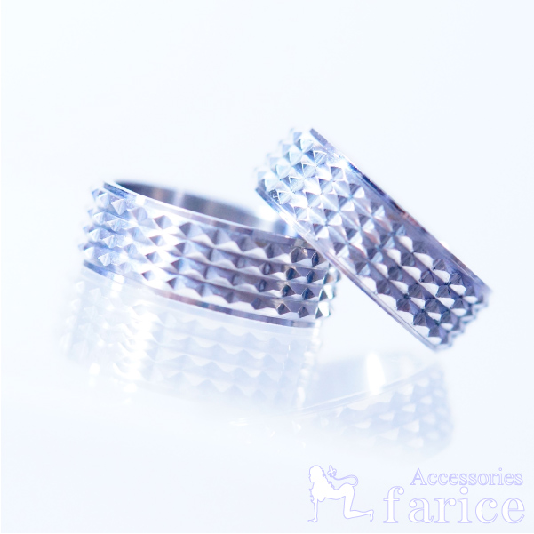 ★商品のサイズ★ 縦約8mm 横約20-26mm 厚さ約2.5mm 重さ約5.9-7.0g ★素材★ チタン ★商品のコメント★ リングの表側全面に装飾されたピラミッド状立体スクエア型スタッドが、抜群の存在感と男っぽいタフな雰囲気を十分に感じさせるユニセックス・ハードデザインリングです。見た目のゴツゴツとしたフォルムはただハードなだけではなく、ひとつひとつのスタッドが光を乱反射させ、さらに無数に配置されたことでその輝きは指元で十二分に発揮されます。縦約8mmと広めにとられたリング幅を採用することで一層その美しい輝きを増しています。石を使わない潔さもシンプル&ハードなデザインとよく合っていてとっても良いですね。見た目はガチガチのハード系スパルタンモデルですが、意外にもいろんなファッションスタイルに合わせやすく、着けるだけで普段とは違ったワイルド感のあるイメージを演出してくれます。シンプルながらも独特のデザイン性と十分過ぎる程の存在感で指元を個性的に彩ってくれますのでハードファンならずともオススメできるチタンリングです。