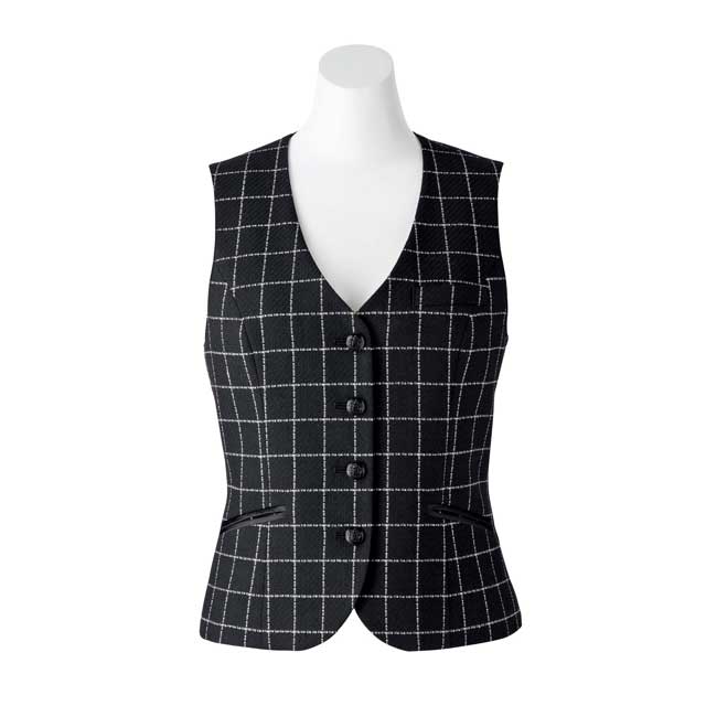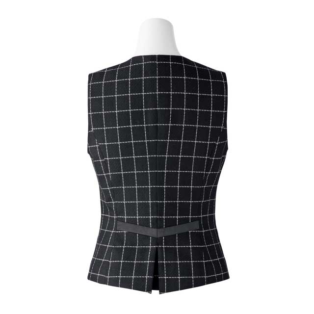 女性らしい深みブラックで魅せるモダンエレガントな上品さが魅力のチェックベストです。深みのあるブラックと豊富なアイテムバリエーションで、どんな職種にもマッチします。チェック柄をブラックで大人モードに着こなしてくださいね。