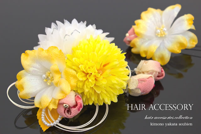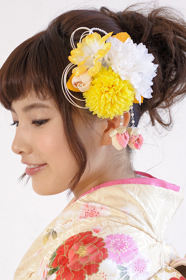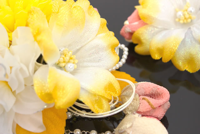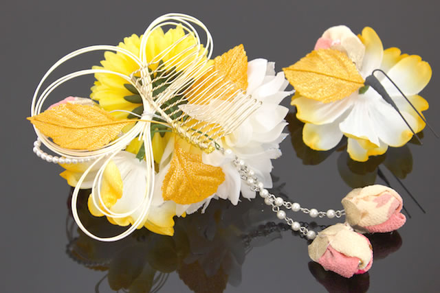 また。両サイドではなく、2点を片方に寄せてお使いいただくとアシンメトリーなボリュームを出すヘアスタイルなどにも対応出来ます。成人式の振袖や、卒業式の袴など、華やかなお着物にオススメです。