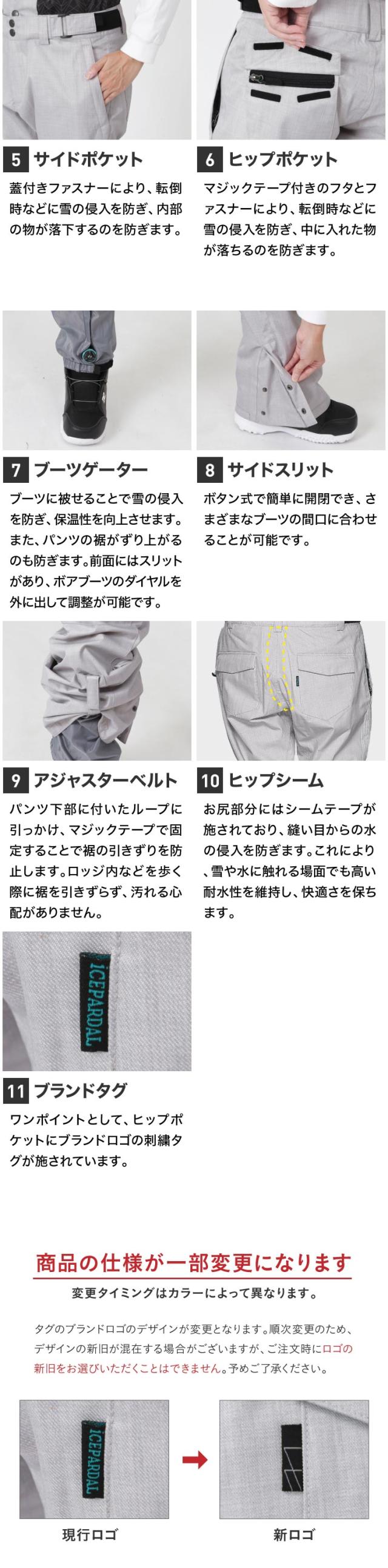 パンツはOC STYLEの自社ブランド「ICEPARDAL(アイスパーダル)」製。スタイリッシュなデザインながら動きやすさと防寒性を兼ね備え、スノーボードからスキーまで幅広く対応できる万能モデルです。耐水圧・透湿性ともに高く、長時間のライディングでも快適な着心地をキープ。