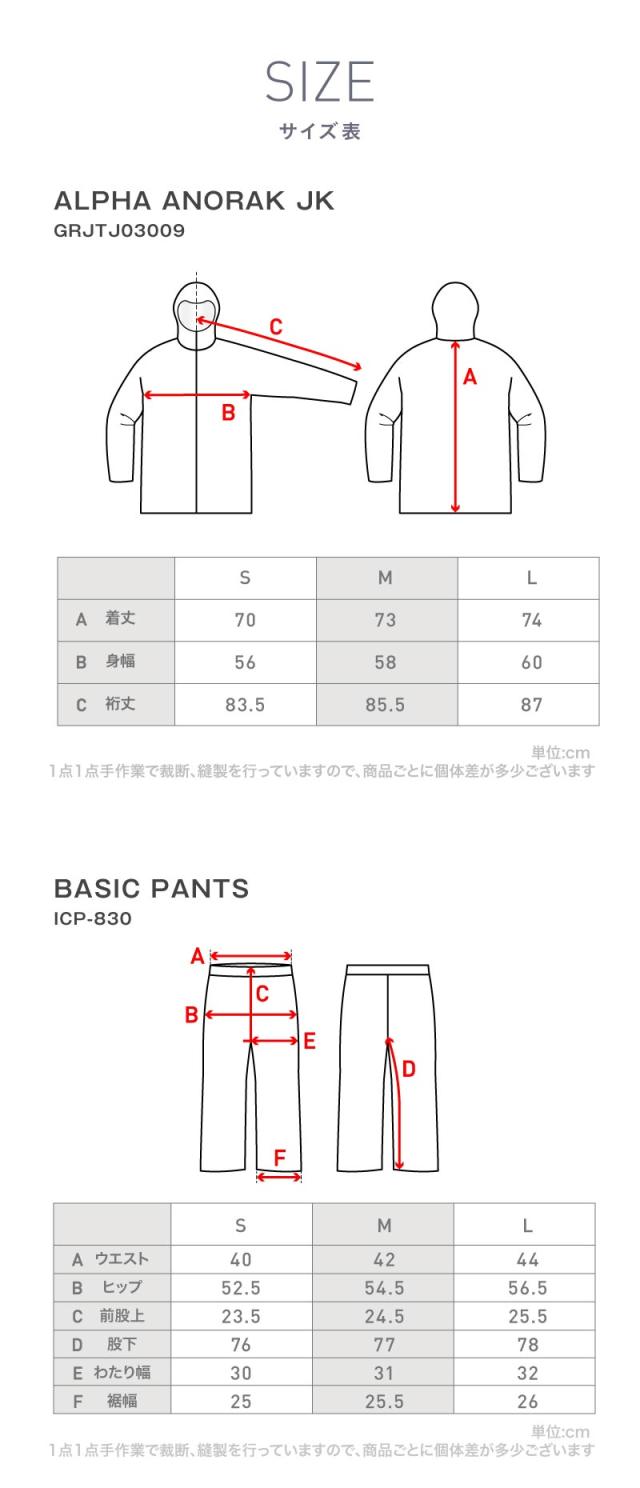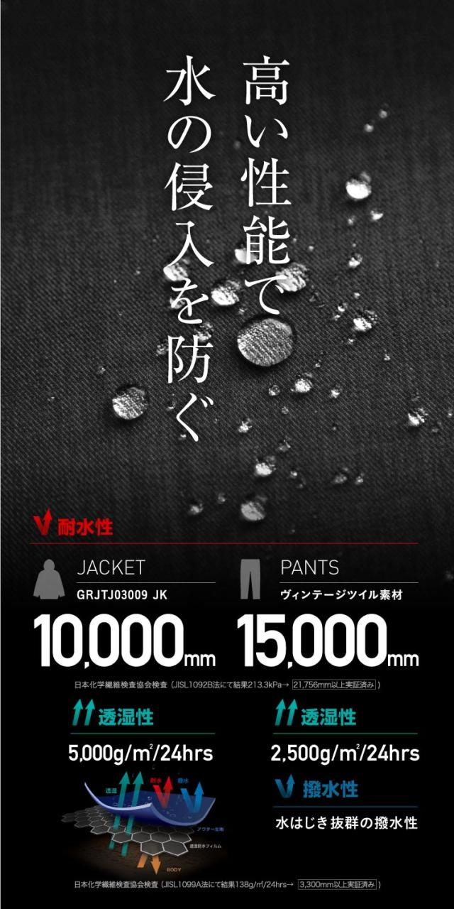■耐水性:ジャケット 10,000mm パンツ5,000g/m2/24hrs