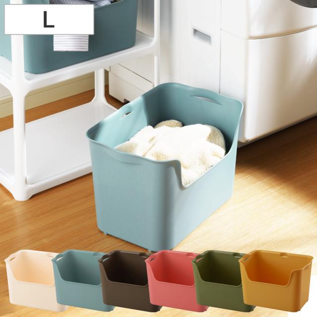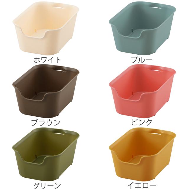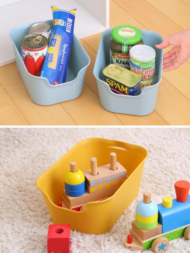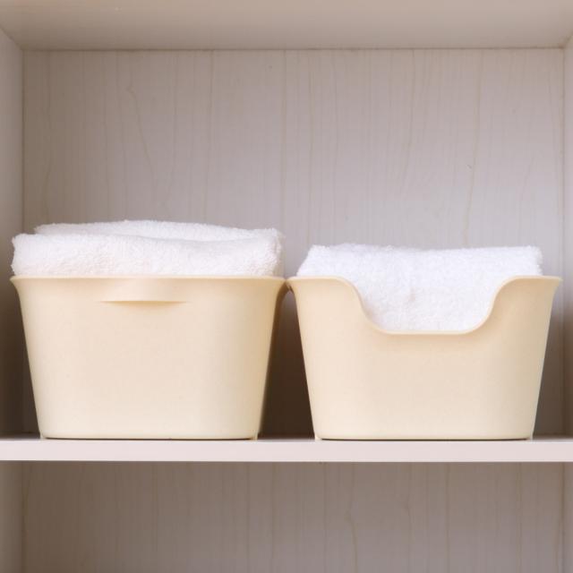 大きく開口した前面は、パッと見た時に中身がわかりやすく、引出しやすい形状です。背面は目立ちにくい小さな持ち手のスッキリしたデザインで、シンプルなインテリアを好まれる方や生活感を見せたくない方に最適です。