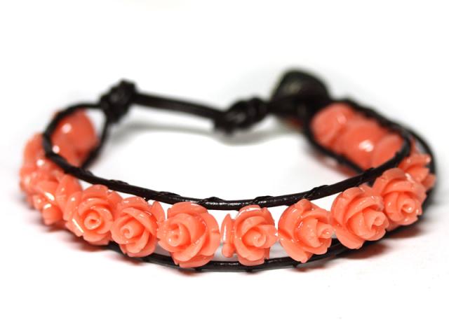 本革と珊瑚を使用したブレスレットです。薔薇は本物のように細部まで表現されており、少し個性的なお洒落のワンポイントとしてお使いいただけます。
