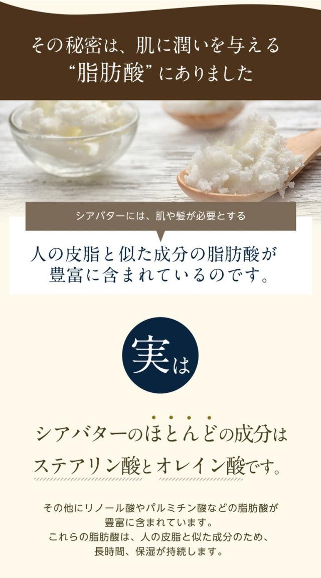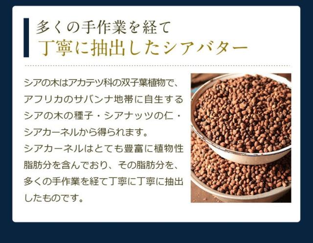 【特徴】アフリカのサバンナ地帯に自生するシアの木の種子・シアナッツの仁・シアカーネルから得られます。シアカーネルはとても豊富に植物性脂肪分を含んでおり、その脂肪分を、多くの手作業を経て丁寧に丁寧に抽出したものです。