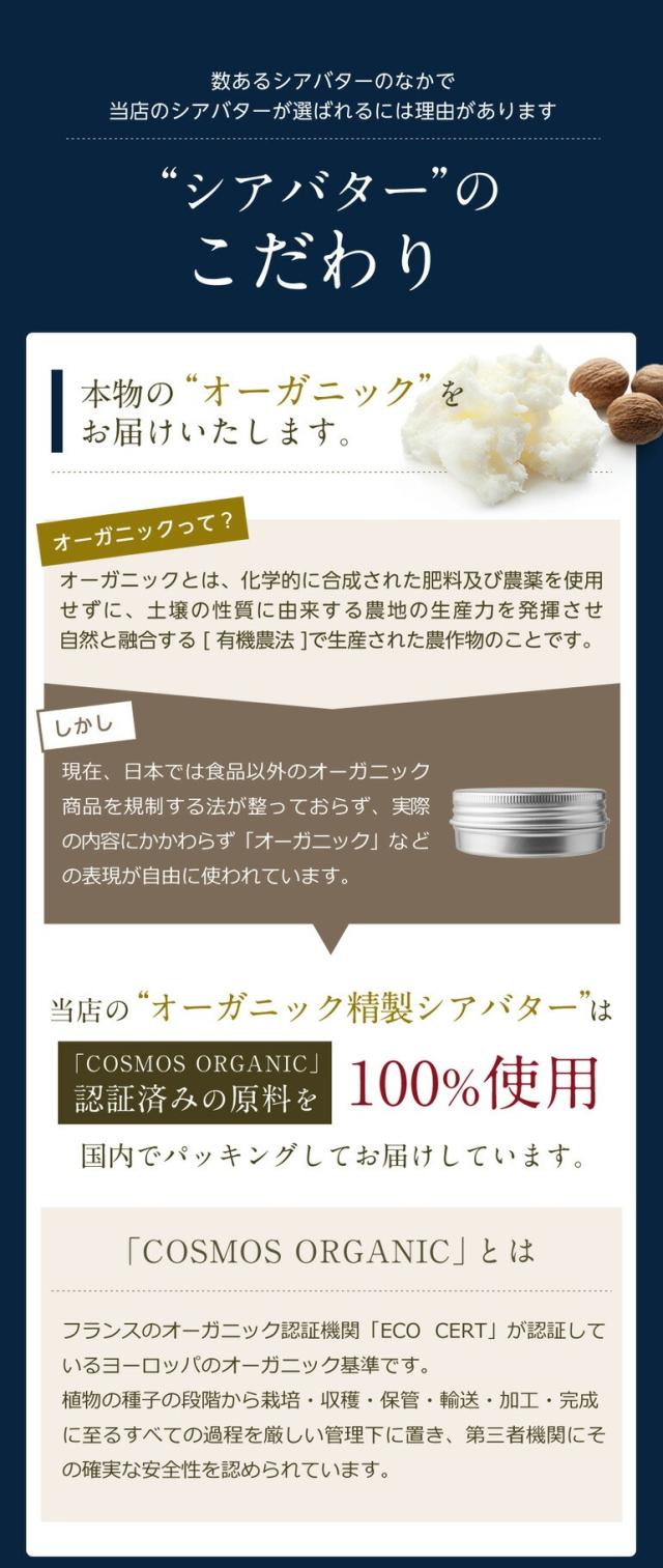 - 輸入の安価な物を使用していましたが、到着時に劣化しており、違う商品を探しておりました。 シアバターを使った事がある方なら十分満足できる品質だと思います。
