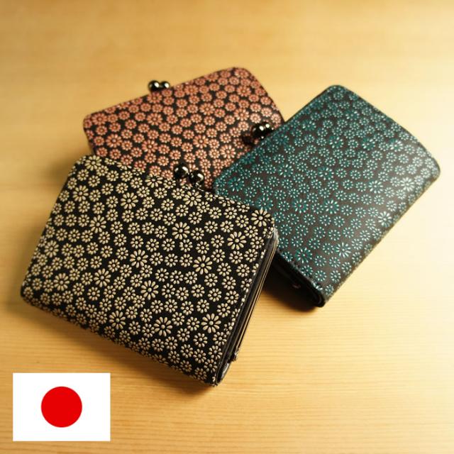 【送料無料・日本製・本革】和風菊柄印伝レディースがま口二つ折り財布【古都印伝】かわいい・キュート・デイジー・漆・伝統工芸