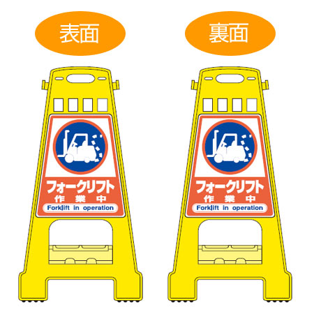 バリケードスタンド 「フォークリフト作業中」 両面表示 サインスタンド 高さ60cm ( 立て看板 標識 案内板 フロアサイン )