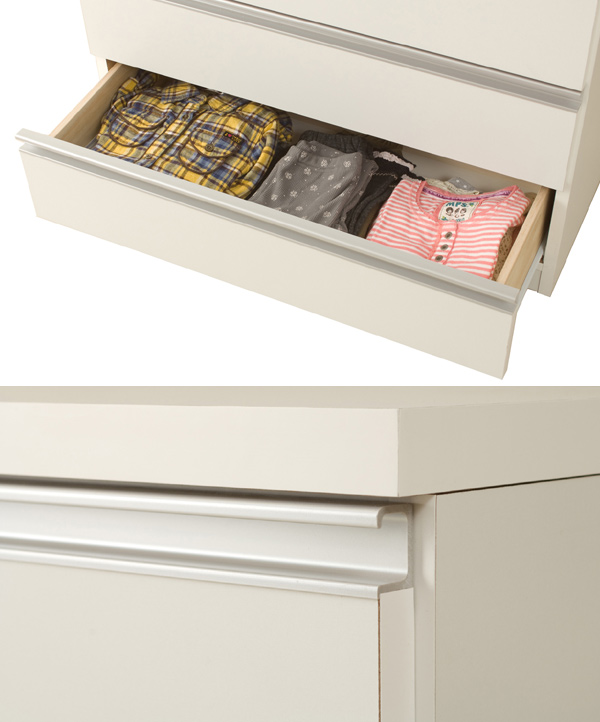 シルバーの引き手部分は指がスッと入り、引き出しやすい形に造られています。また取っ手が付いていないのでスッキリとフラットなデザインです。