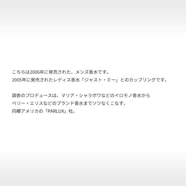 こちらは2006年に発売された、メンズ香水です。2005年に発売されたレディス香水「ジャスト・ミー」とのカップリングです。