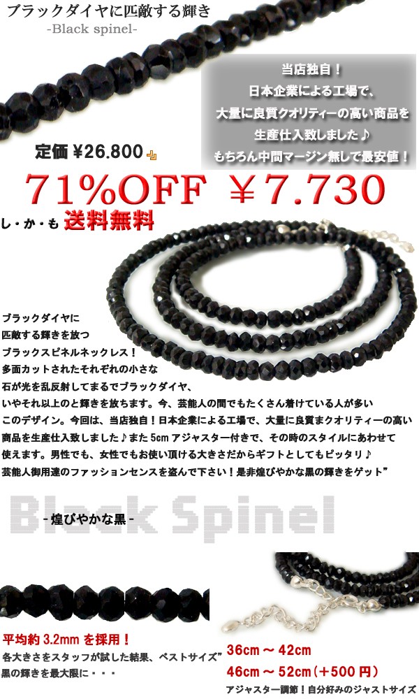 テレビや雑誌、メディアでよく見る芸能人御用達ブラックピネルネックレス!ブラックダイヤに匹敵する輝きを放つ!5cmアジャスター付きで、男女問わずお使い頂ける大きさだからギフトとしてもピッタリ♪2重ブレスレットとしても大人気。