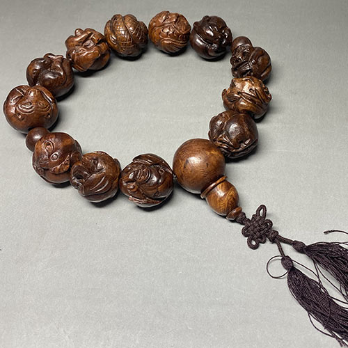 材質:木 (栃の木の一種)大きさ:直径約2.5センチ 13玉 念珠の直径約14センチこの木は中国で「マリ」といわれる栃の木の種類で魔除けのパワーがあるといわれます。一つ一つ手彫りで十二支を工夫して彫っています。十二支なので八卦化殺十二方位牌と同じようにどの生まれ年でも、どの方位でも守ってくれるパワーがあるといわれます。手作りなので一つ一つ形が多少変わることがあります。