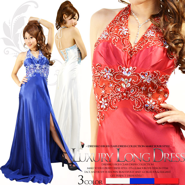 セール 値下げ【送料無料】スリットから魅せる美脚◆ウエストメッシュ&背中スピンドルにビーズと宝石煌めくRICHロングドレス キャバドレス