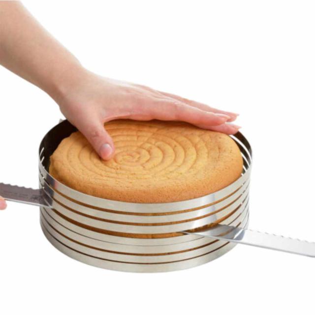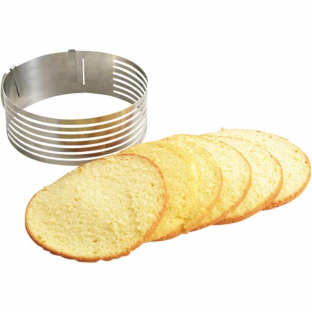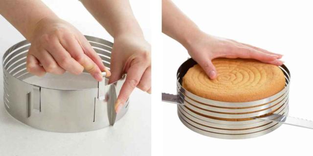 ケーキのサイズに合わせてクリップで大きさを調整できます。横から切れ込みにナイフを入れて、好きな幅でスポンジをスライスできます。薄くしたり厚くしたりと、好みに合わせてスライスできるので便利です。
