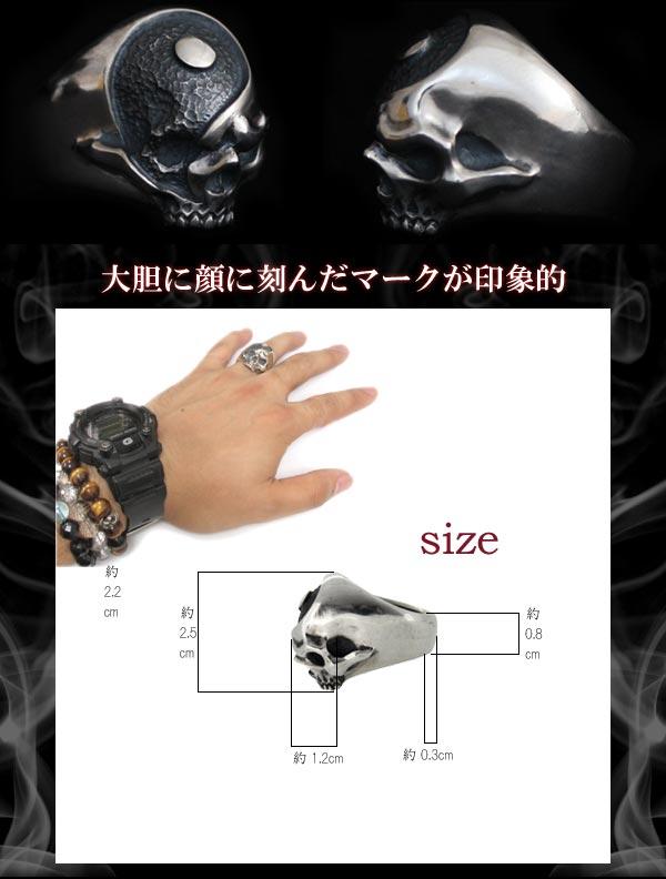 下あごの無いスカルに陰陽のマーク「タオ」を大胆に刻んだシルバーリングです。