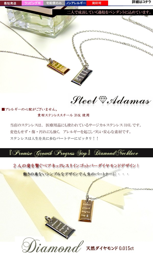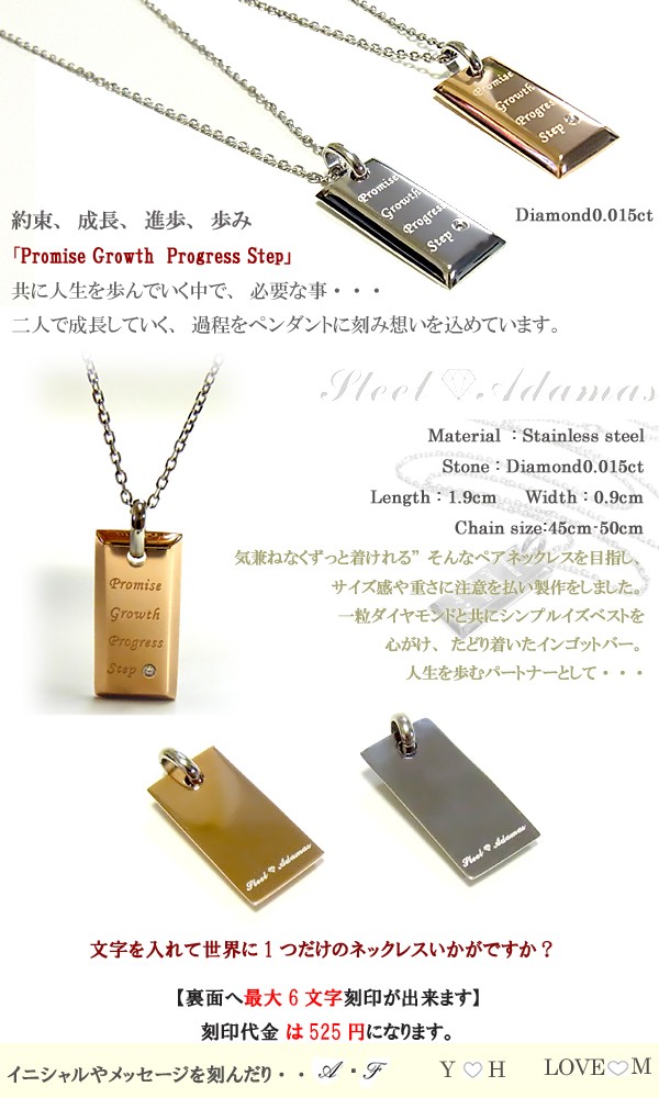 2人の絆を深めるペアネックレス★約束、成長、進歩、歩み 二人で成長していく過程をペンダントに込めています。 ダイヤモンド×ステンレススチール316L。アレルギーフリーで、錆びにくいステンレスは手入れも簡単。手軽に扱えるステンレス素材ながら、溢れる高級感が自慢のネックレスです。