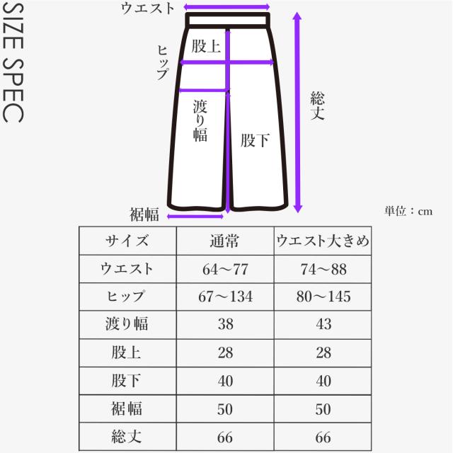 総丈66cmウエスト64〜77cmヒップ67〜134cm裾幅50cm前股上28cm股下40cmわたり幅38cm