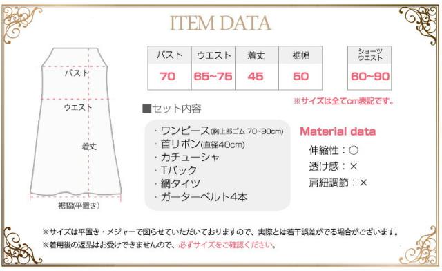 バスト 70cm ウエスト 65-75cm 着丈 45cm 裾幅 50cm ショーツウエスト 60-90cm 首リボン直径 40cm