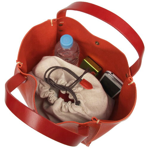 傷つきやすいレザーを、内側からしっかりと保護してくれる上に、巾着の中に財布や携帯電話等の小物を入れることで、小分け管理も可能です。