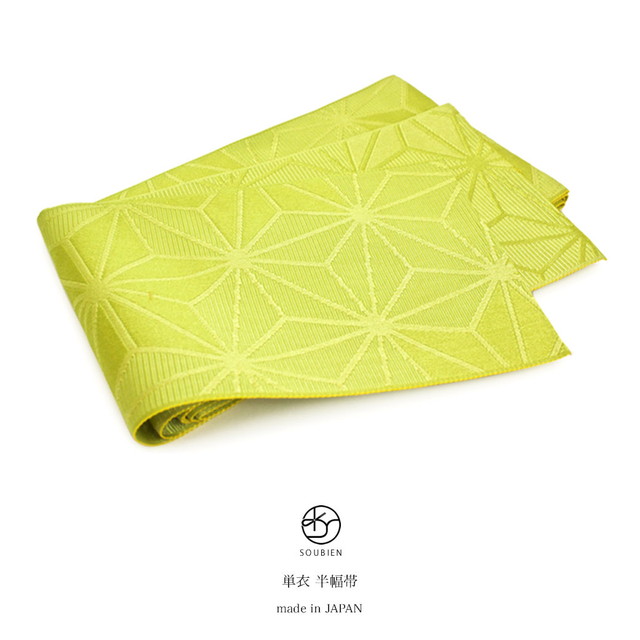 浴衣 帯 半幅帯 黄緑 イエローグリーン 麻の葉 半巾帯 細帯 単衣 女性帯 浴衣帯 浴衣用 袴用 小紋用 紬用 着物用 日本製 メール便対応
