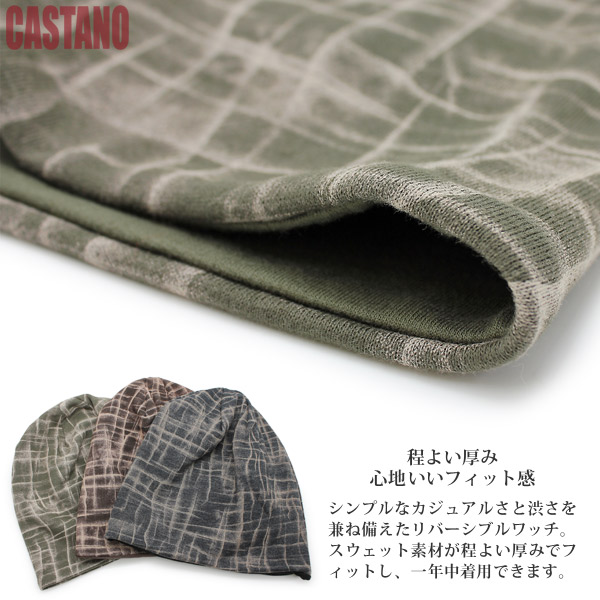 スウェット地の着用感が心地よい、両面仕様のリバーシブルワッチです。クールでかっこいいグラフィックのような抜染柄が際立つデザイン面と、シンプルで使いやすい無地天竺面。その日のコーディネートに合わせてうまく使い分けできるので、幅広いスタイルの方に愛用していただけると思います。生地も程よく厚めで安定したフィット感を楽しめます。
