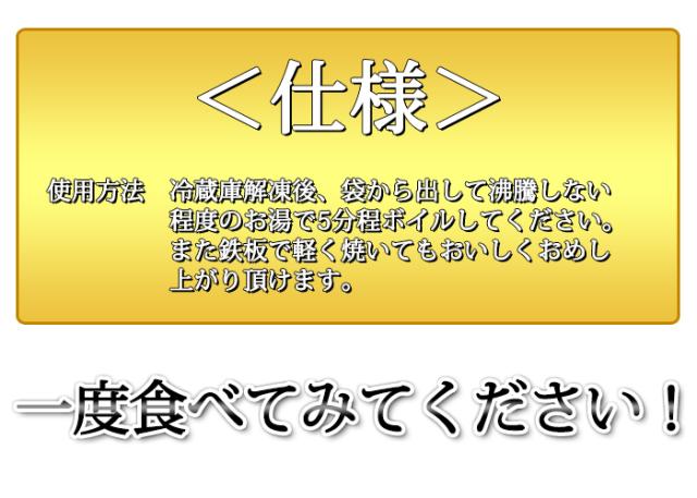冷蔵庫解凍後、袋から出して沸騰しない程度のお湯で5分程ボイルしてください。また鉄板で軽く焼いてもおいしくお召し上がり頂けます。