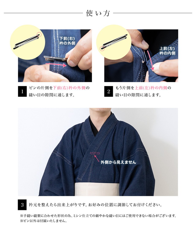衿合わせのお好みの位置に、上前・下前それぞれの衿付けの縫い目の間に通して使用します。