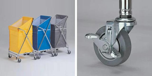 | 連結できるから移動もスムーズ 2台3台と簡単に連結できて、移動もスムーズです。 | 老化に強いキャスター付き オレフィン系エラストマー製のキャスターは老化に強く床を汚しません。キャスターの2ヶ所にストッパー付きです。 ※キャスター直径:約7.5cm |