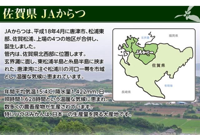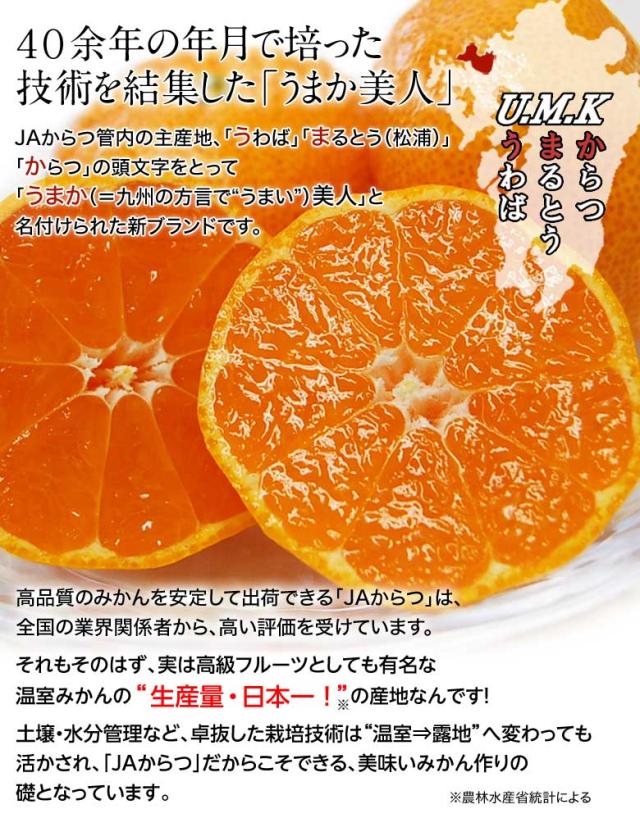 JAからつと言えば、ハウスみかんの栽培で日本一のブランド産地です。『うまか美人』は、JAからつ管内のみかん主産地、「うわば」「まるとう」「からつ」の頭文字をとって、平成24年度に生まれました。
