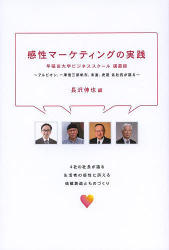 早稲田大学ビジネススクール「感性マーケティング論(アルビオン寄附講座)」のうち、ゲスト講座をまとめたもの。そのなかでも永続的な企業である末富(山口富蔵ご主人)、虎屋(黒川光博社長)、一澤信三郎帆布(一澤信三郎社長)、アルビオン(小林章一社長)の4人に登場してもらう。機能的価値だけではなく、感性に訴える価値とは?