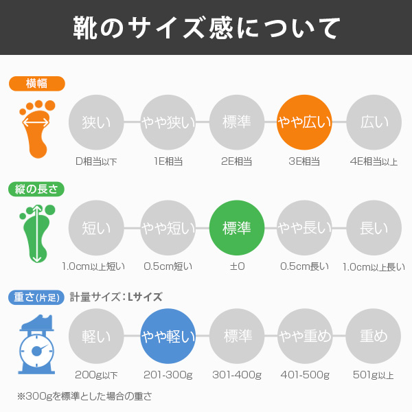 | こちらの商品は【一般的な革靴サイズ(幅広3E)】です。普段お履きの革靴サイズをオススメします。 幅広設計なので、甲高・幅広の方も通常のサイズをオススメします。 【男性スタッフSHO(172cm) 普段のサイズは、革靴26.5cm/日本製スニーカー27.0cmです】 私のジャストサイズはL[26.0-26.5cm]でした。靴下を履いて、ゆったりとしたフィット感のあるサイズです。 サンダルタイプなので、通常よりゆったり感じるかと思います。 ピッタリ履きたい方は、ワンサイズ下をオススメします。 |