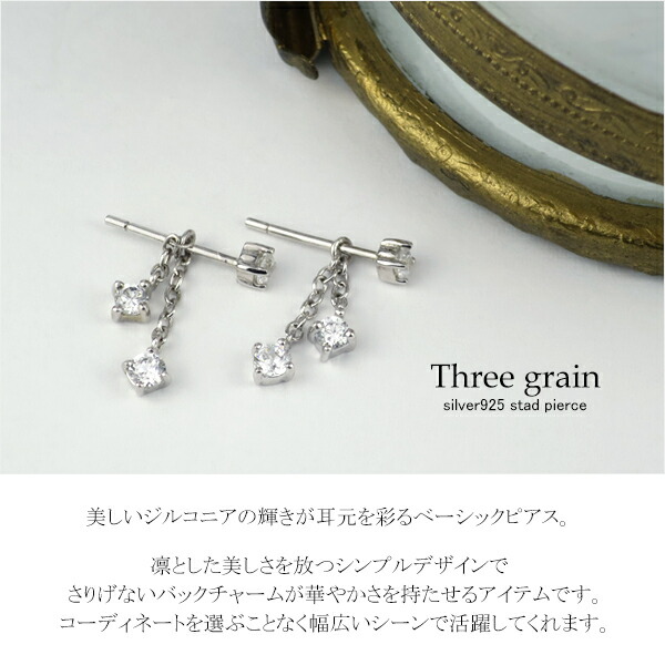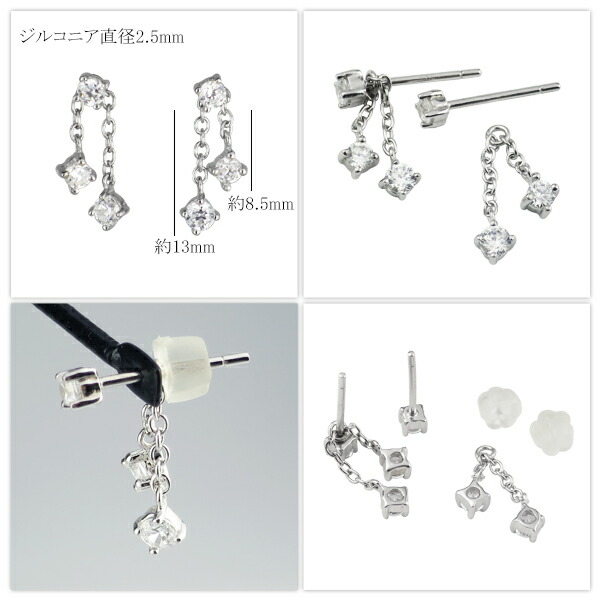 チェーン&トリプルジルコニア シルバーピアス 2P 両耳 オシャレ かわいい 可愛い ギフトBOX