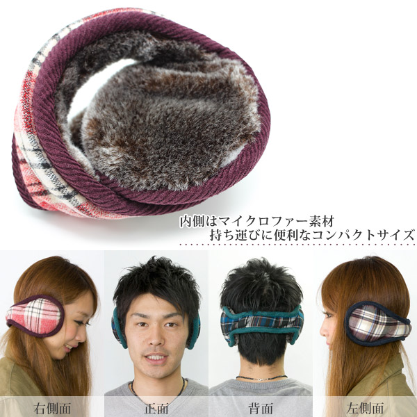髪型やトータルコーディネートの邪魔にならない、バックアームタイプのイヤーマフラーです。外側は誰もが気軽に合わせやすいネルチェック柄、内側はしっかり保温してくれるマイクロファーを使用していますので、寒い日にオススメ!必要ない時には小さく折りたためますので、通勤時やお出かけ時などの防寒アイテムにも適していますよ。
