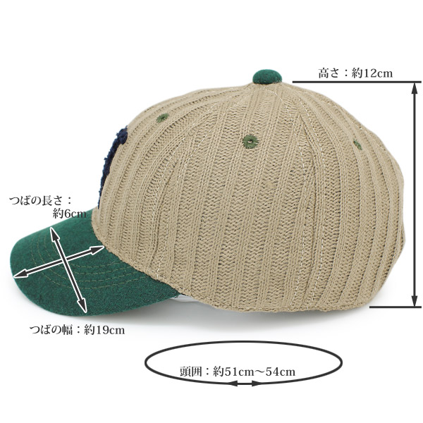 | サイズ | サイズ表記52〜54cm(頭囲:約51〜54cm[後部にゴムを使用]、高さ:約12cm、つば:長さ約6cm・幅約19cm) |