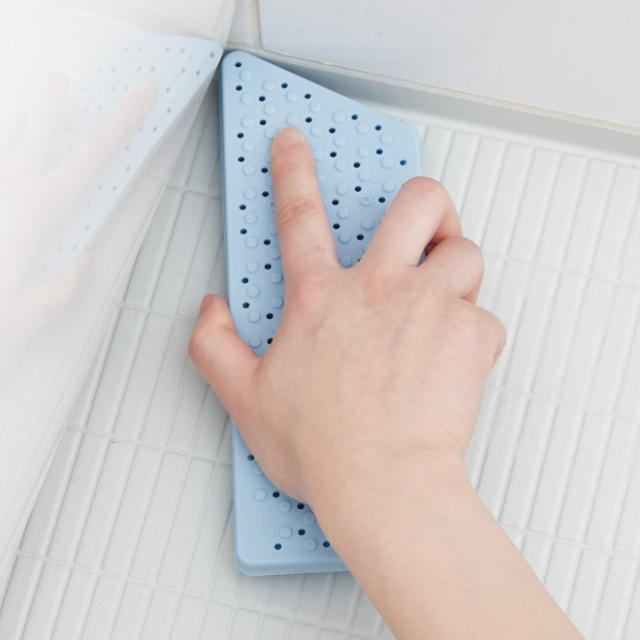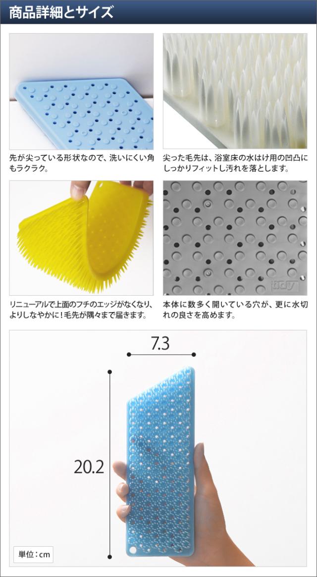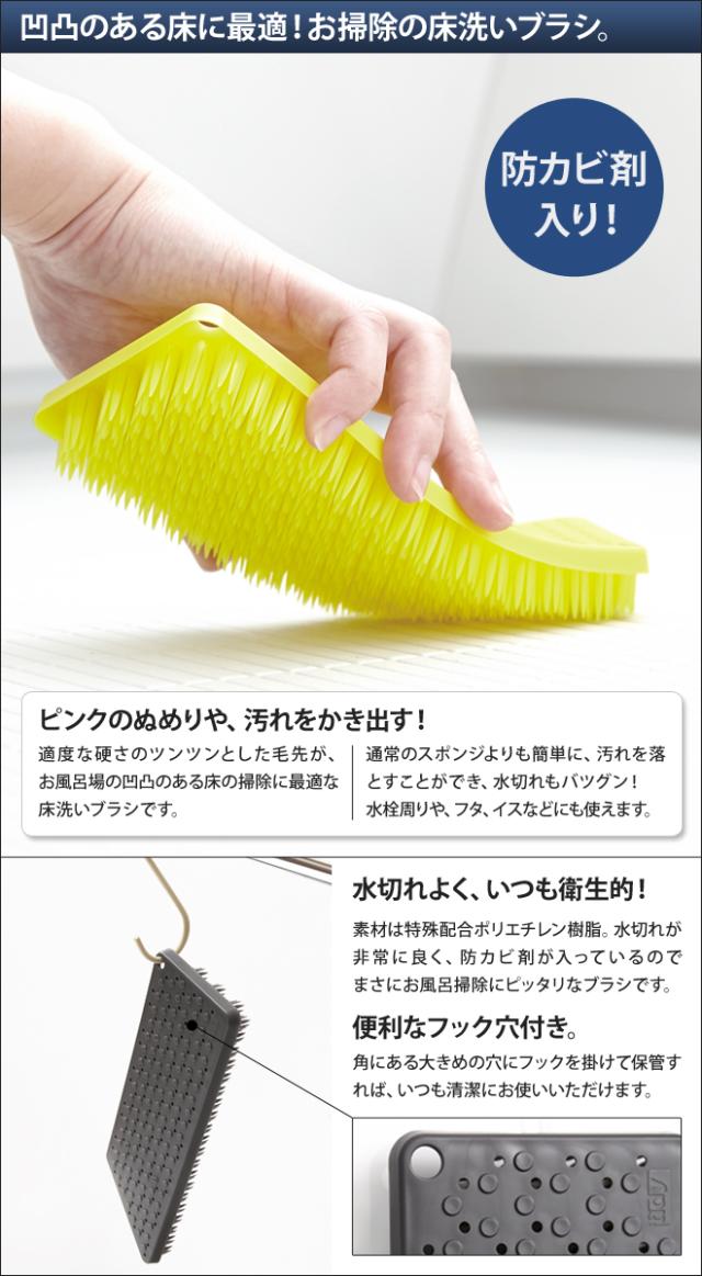 適度な硬さのツンツンとした毛先が、お風呂の凹凸のある床の掃除に最適。通常のスポンジよりも簡単に、汚れを落とすことができます。水切りも非常によく、防カビ剤入りの素材なので、いつも清潔にお使いいただけますよ♪