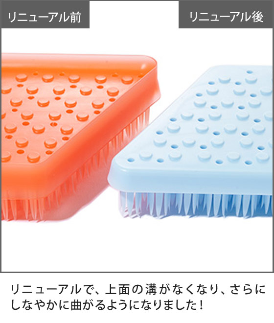 プラタワ・フォーバスという名前の通り、お風呂の床のような溝のある場所は、スポンジに比べて汚れが落としやすいですね。このブラシを使うと凹凸部分に突起が入り込んで、汚れを落としてくれるのが実感できます!リニューアルでよりしなやかに曲がるようになり、コーナーも洗いやすくなりました!