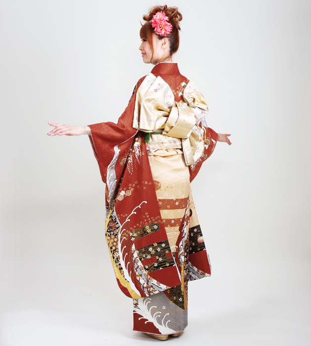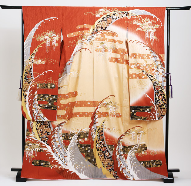 成人式 1月使用 振袖 レンタル オレンジ・ゴールド・朱赤色 波に熨斗 NT-136-sei 送料無料