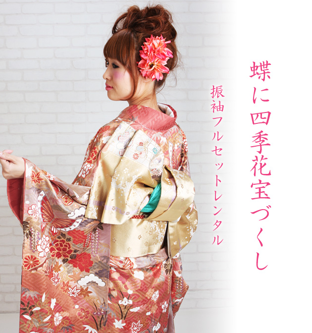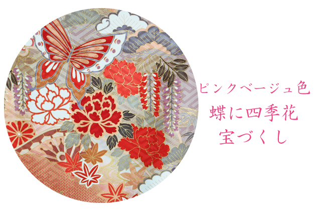 成人式 1月使用 振袖 レンタル ピンク・ベージュ色 蝶に四季花宝づくし NT-124-sei 送料無料