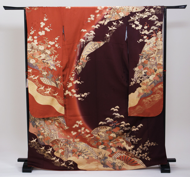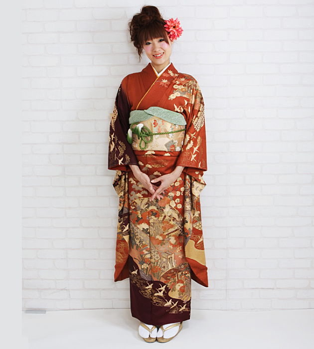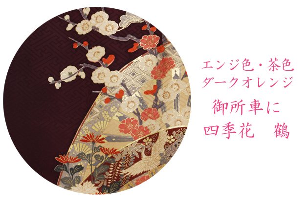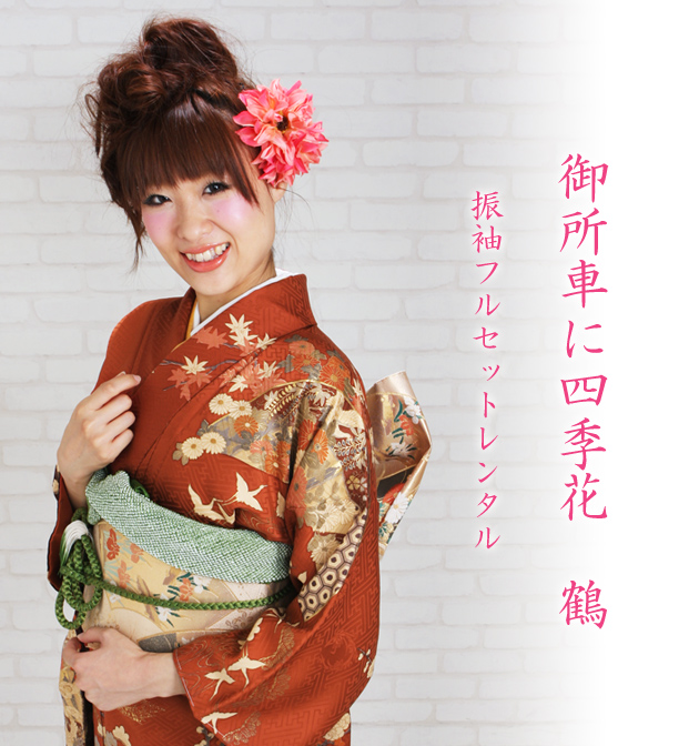 成人式 1月使用 振袖 レンタル エンジ・ダークオレンジ・茶色 御所車に四季花・鶴 NT-177-sei 送料無料