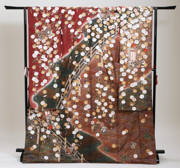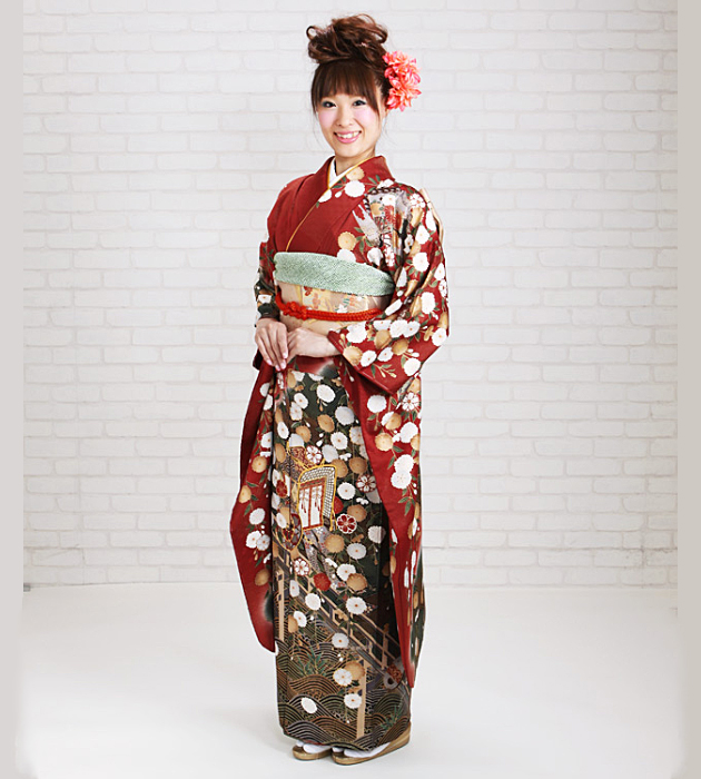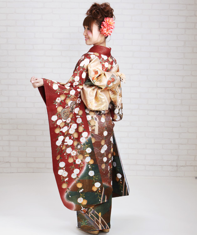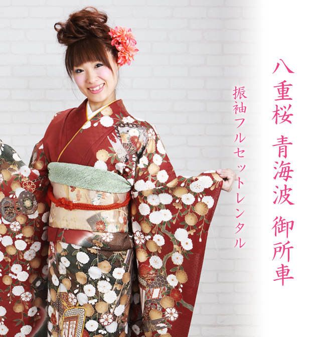 成人式 1月使用 振袖 レンタル レンガ色 八重桜・青海波・御所車 NT-172-sei 送料無料