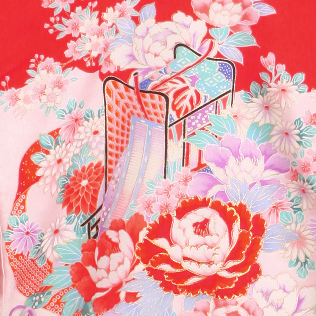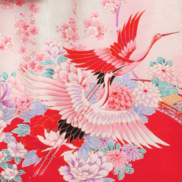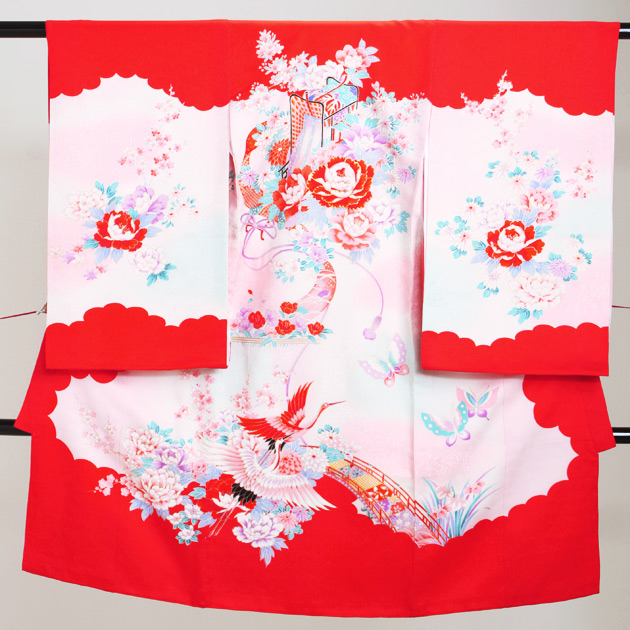お宮参り 着物 女の子 赤 ピンク/御所車・鶴 l-55 日本製高級正絹 産着 レンタル 着物 送料無料
