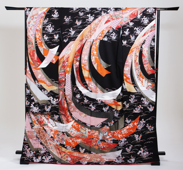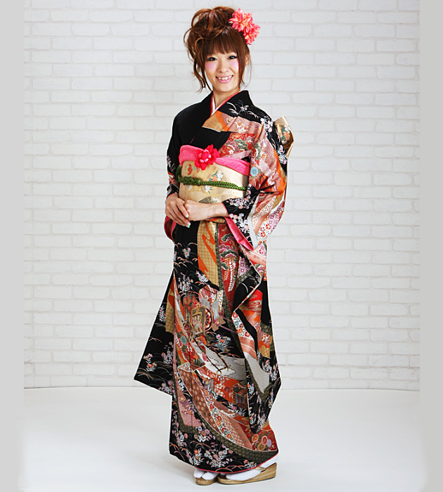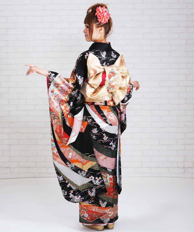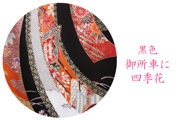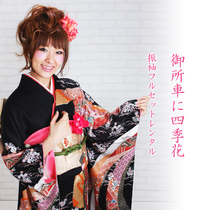 振袖 2月〜12月使用 振袖 レンタル 黒色 御所車に四季花 NT-132 送料無料
