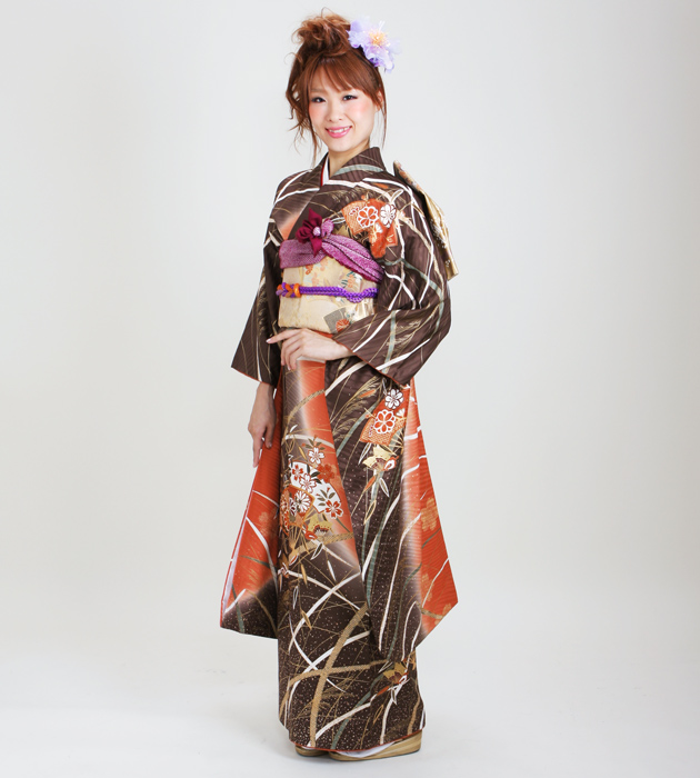 振袖 2月〜12月使用 振袖 レンタル 茶朱色 扇面に蝶 NT-167 送料無料
