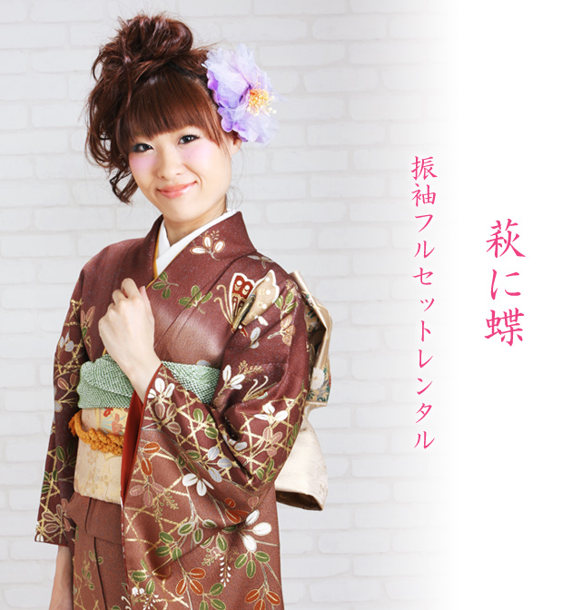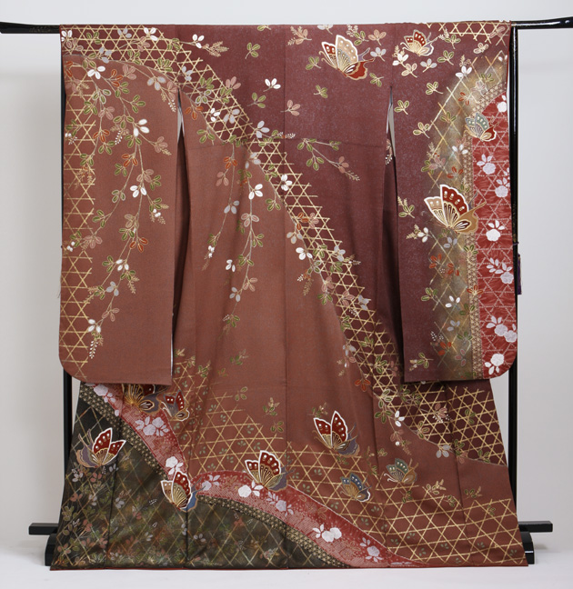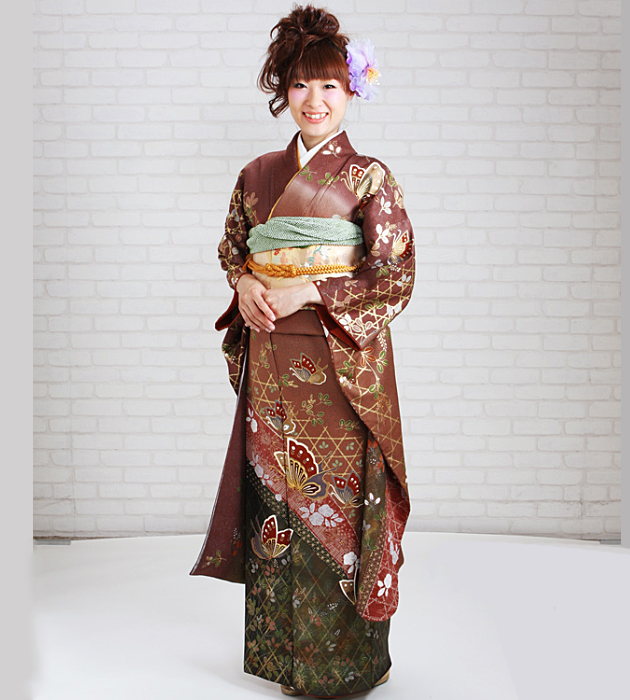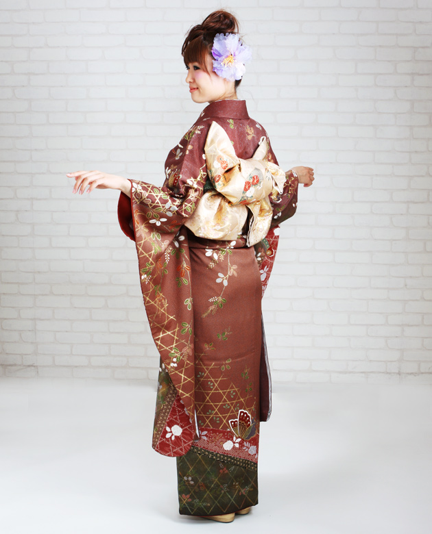 振袖 2月〜12月使用 振袖 レンタル 茶・エンジ色 蝶 NT-176 送料無料